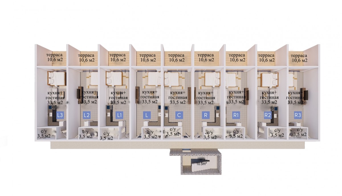 - гостиная, совмещённая с кухней;