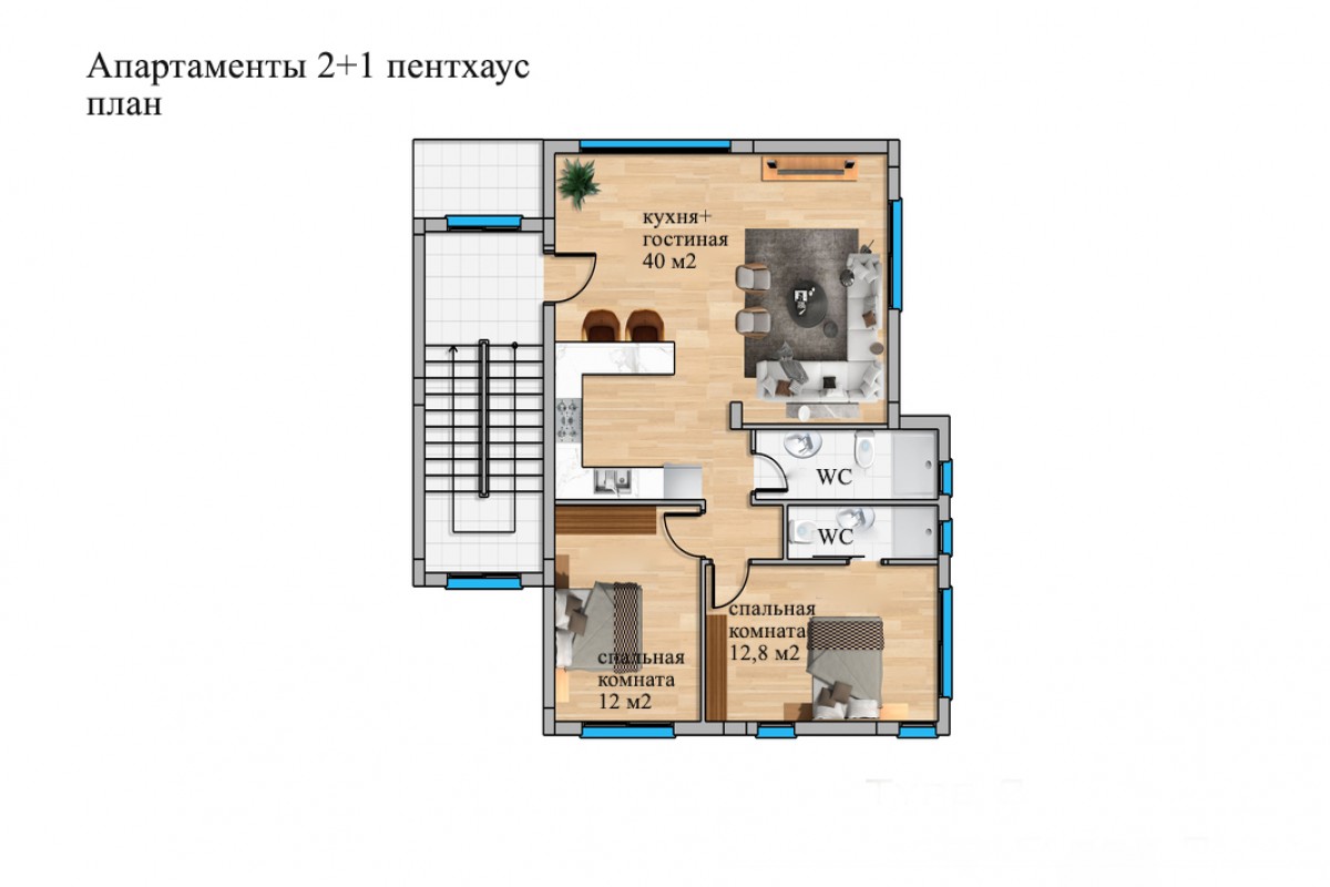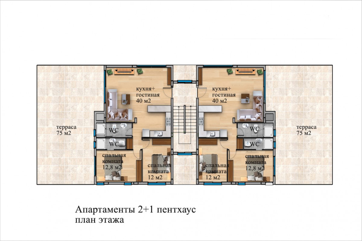 Апартаменты 2+1 пентхаус состоят из:
