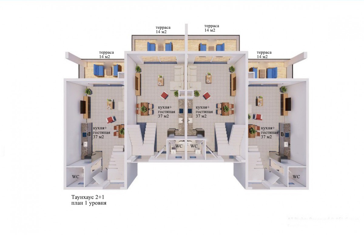 На таунхаусы предоставляется беспроцентная рассрочка. В цену включена полная отделка, встроенная мебель (все спальни оборудованы встроенными шкафами, на кухне предусмотрена встроенная кухня), сантехника. Установлены система давления воды, окна с двойным стеклопакетом, межкомнатные двери, теплый пол в ванной. Таунхаусы с 2мя спальными комнатами и 1 гостиной расположены в блоках, рассчитанных на 4 семьи.