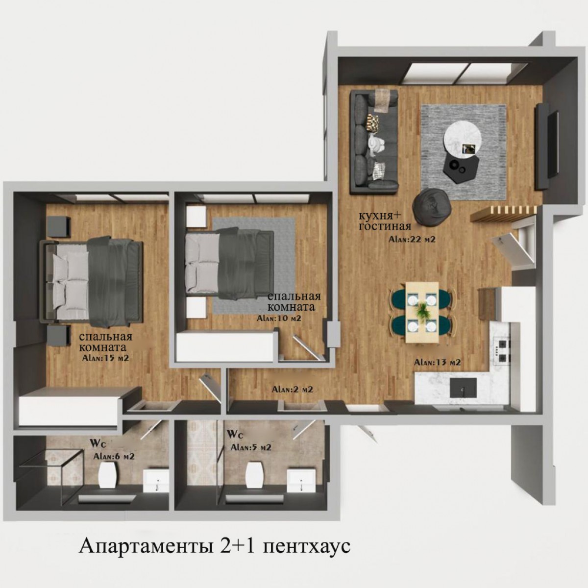 Апартаменты 2+1 пентхаус находятся на 2 этаже, имеют просторную видовую террасу на крыше с золой барбекю и перголой. В цену квартир включена полная отделка, встроенная мебель (все спальни оборудованы встроенными шкафами, на кухне предусмотрена встроенная кухня), бытовая техника, сантехника, кондиционеры. Установлены система давления воды, окна с двойным стеклопакетом, межкомнатные двери, теплый пол в ванной.