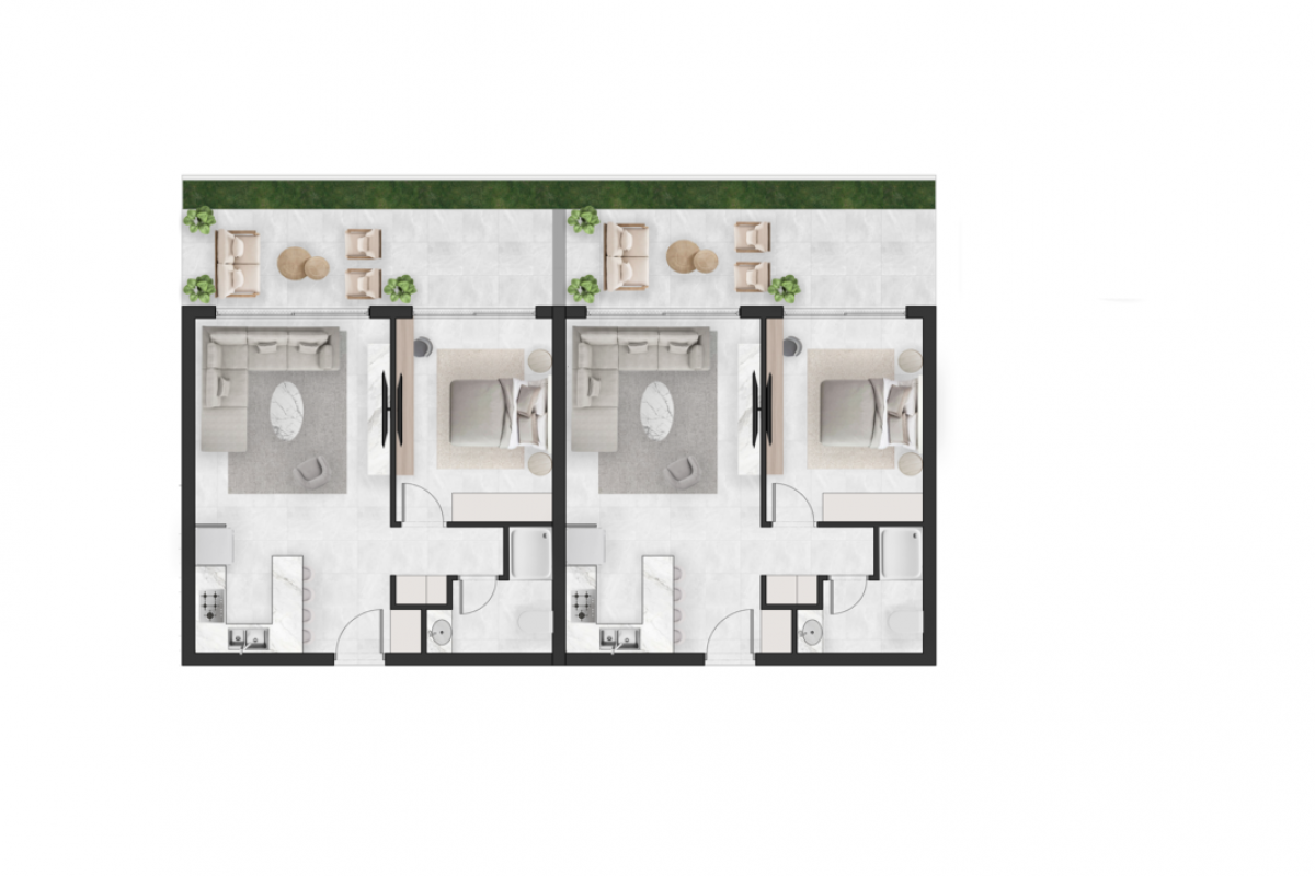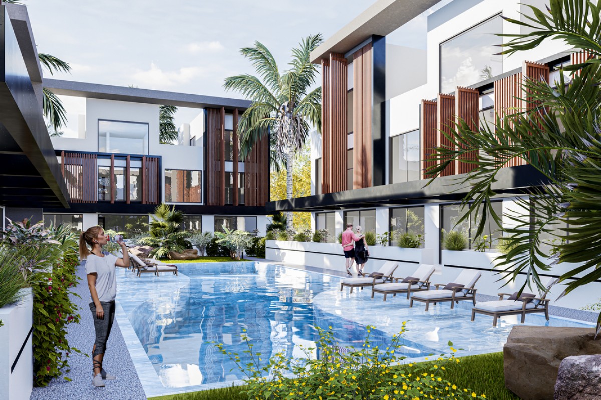 Апартаменты 1+1 расположены на 1м этаже в блоках типа С, которые выстроены вокруг второго общего бассейна. Каждый блок состоит из 4 квартир. Комплекс имеет закрытую территорию со шлагбаумом, обустроен подъездными дорогами, парковками. Инфраструктура включает 2 общих бассейна, ландшафтный дизайн с озеленением, детскую площадку, зоны отдыха с баром у бассейн. В 1 километре от проекта расположен оборудованный песчаный пляж, где собраны многочисленные развлечения. В пешей доступности супермаркеты, кафе и рестораны.