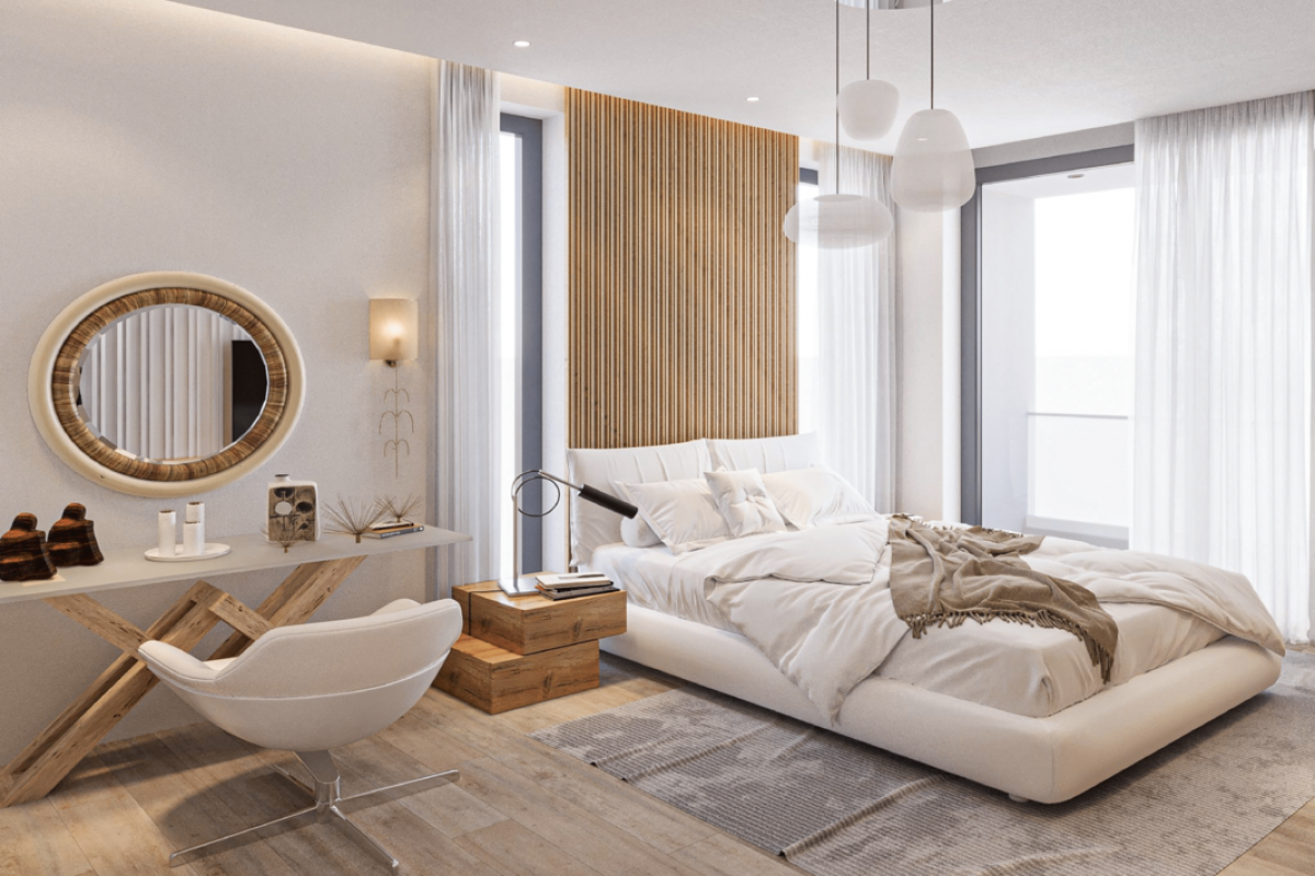 Фасад зданий выполнен в светлых тонах с элементами дизайна из мраморной плитки деревянных панелей. Квартиры имеют панорамные окна, которое обеспечивает максимальное естественное освещение и потрясающий вид. Террасы на крыше имеют возможность установки джакузи.