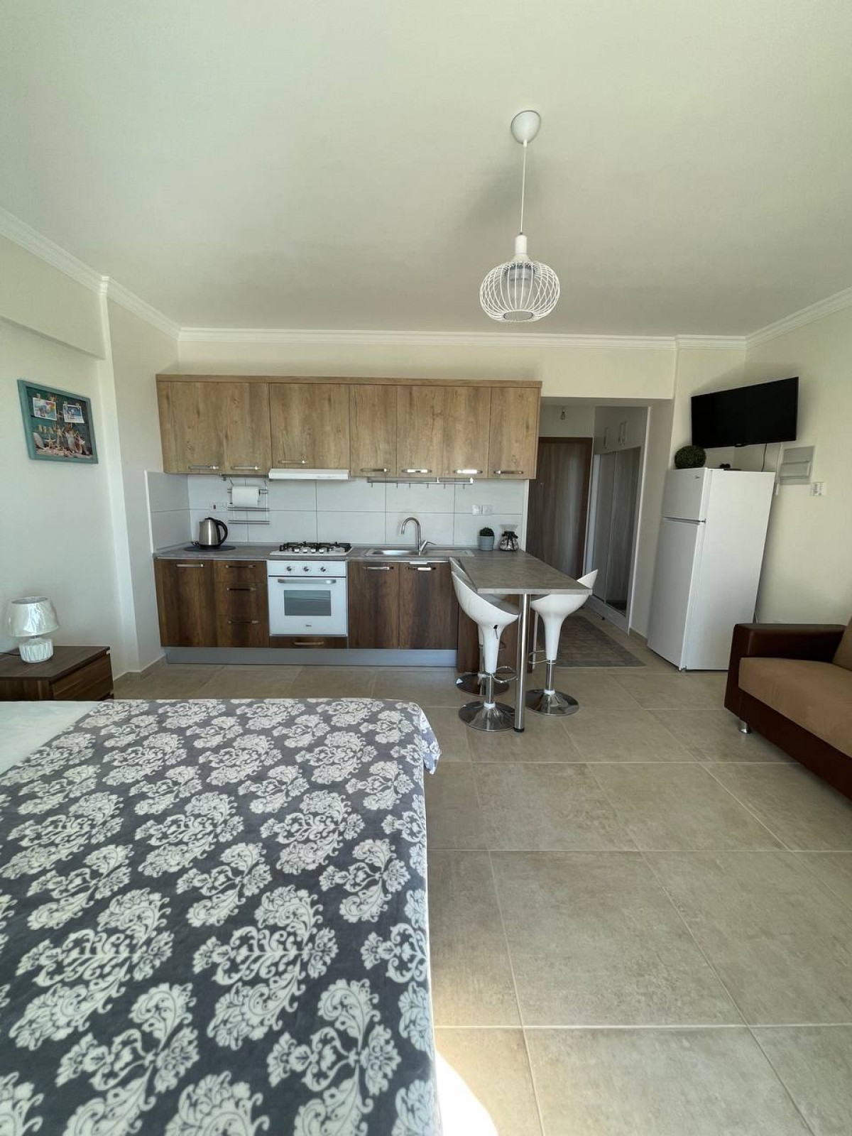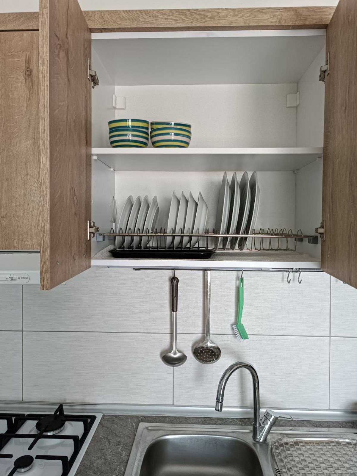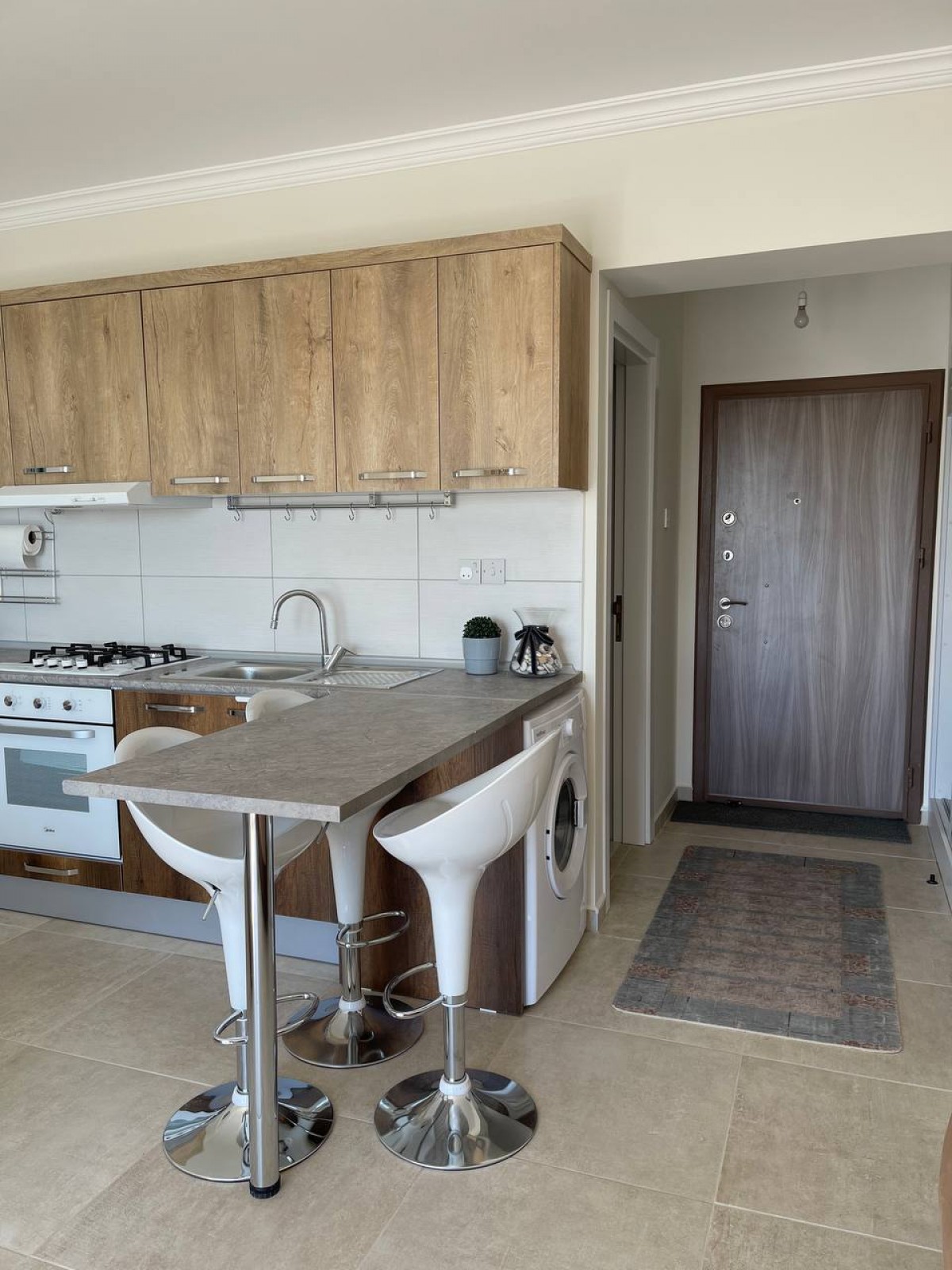 - техника: газовая панель, духовой шкаф, холодильник, кондиционер, стиральная машина, телевизор (смарт ТВ), вытяжка.